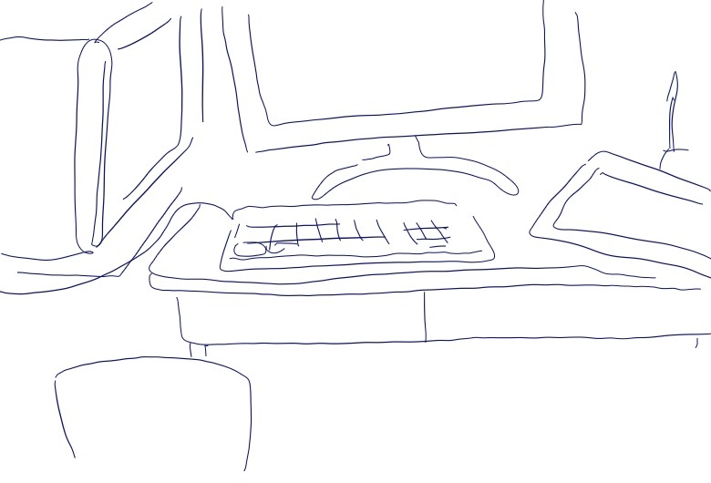 WorkspaceMonitor: 一万くらいScanner: キャノンGraphic tablet: ばんぶーMouse: やっすいやつOn top of the desk: 夢と希望Background music: 実況とラジオTable: あるChair: 青い