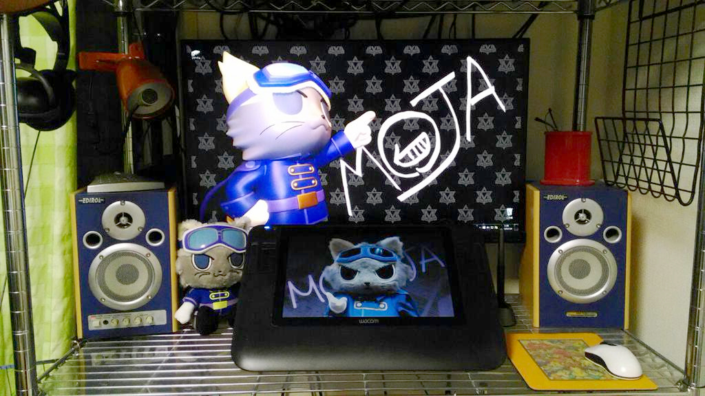 WorkspaceComputer: 自作PCMonitor: PrincetonSoftware used: SAIScanner: CanonGraphic tablet: wacomMouse: なんか顔が描いてあるヤツPrinter: なっしんぐOn top of the desk: カフェオレ、お菓子、イヤホン、付箋Background music: 実況動画Table: カインズで買ったものChair: くるくる回るいす