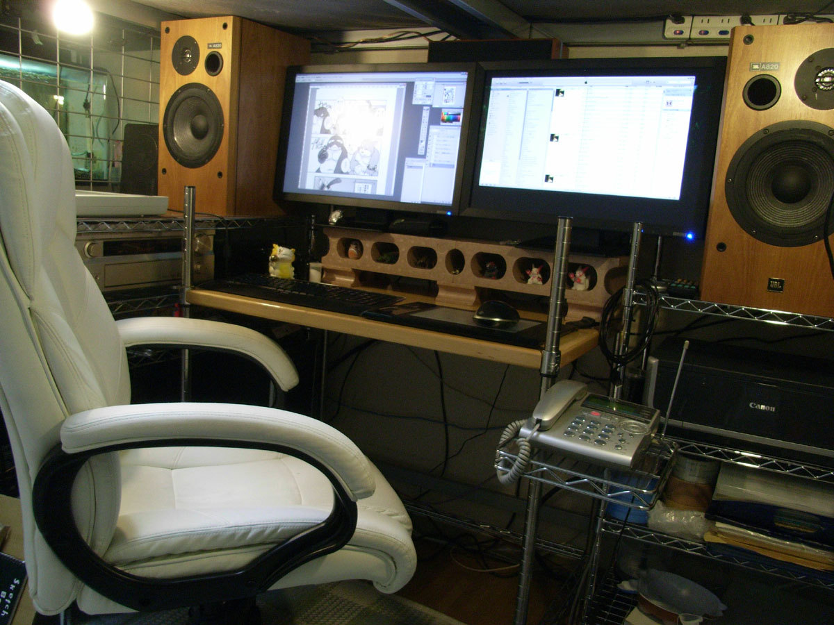 WorkspaceComputer: 自作DOS/Vマシン(Windows XP)Monitor: I-O DATA LCD-AD241XB×2Software used: COREL Painter ⅨScanner: EPSON GT-S630Graphic tablet: WACOM Intuos4(PTK-640)Mouse: Microsoft Explorer MousePrinter: Canon Pixus iP4300On top of the desk: 貰い物のバーボンが……Background music: テクノから演歌まで何でも!wTable: ERECTAChair: 安い社長椅子ImageComment: 原稿がバッサリと・・・